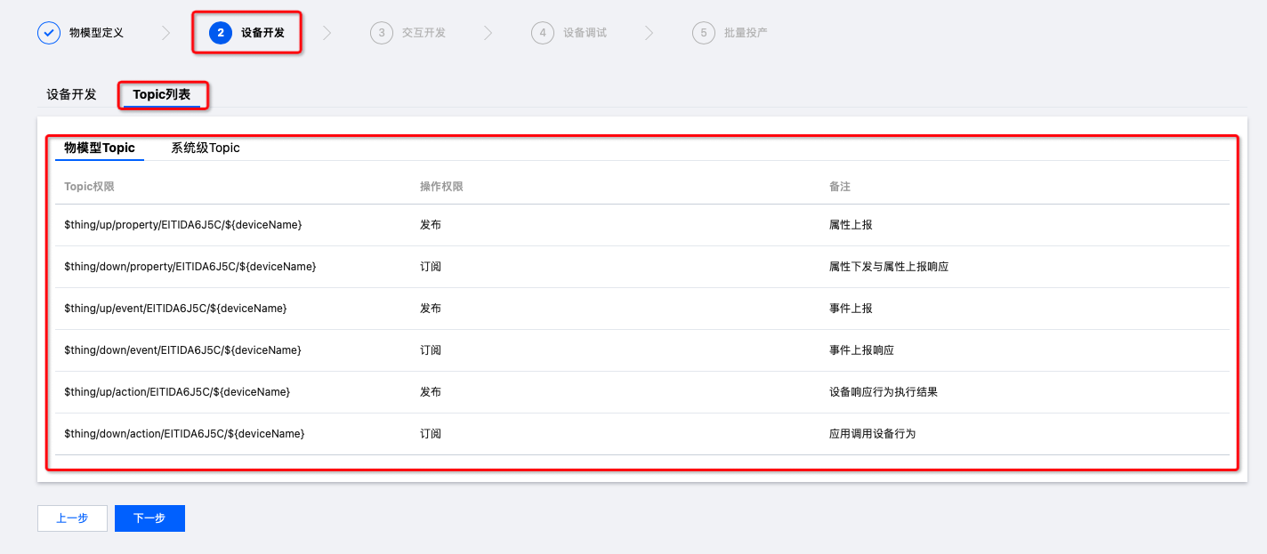 接下来,需要获取通讯时所需要的订阅与发布主题。订阅与发布主题在产品开发中的设备开发可以找到。