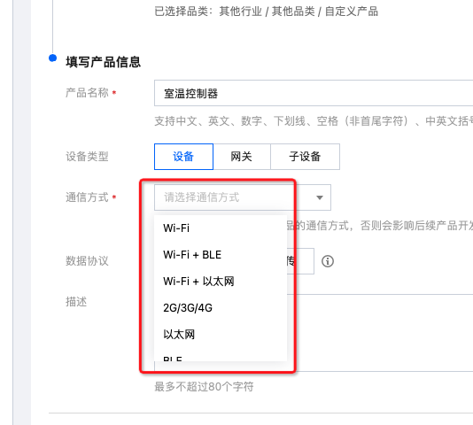随后自定义一个产品名称,设备类型中选择“设备”。